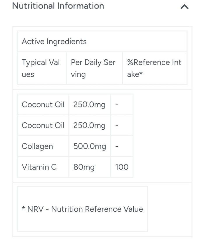 این محصول حاوی کلاژن دریایی - هیدرولیز شده برای بهبود فراهمی زیستی آن - و روغن نارگیل به عنوان منبع طبیعی تری گلیسیریدهای زنجیره متوسط است. ویتامین C اضافه شده به آن به تشکیل کلاژن در بدن و حفظ وضعیت پوست ما کمک میکند.