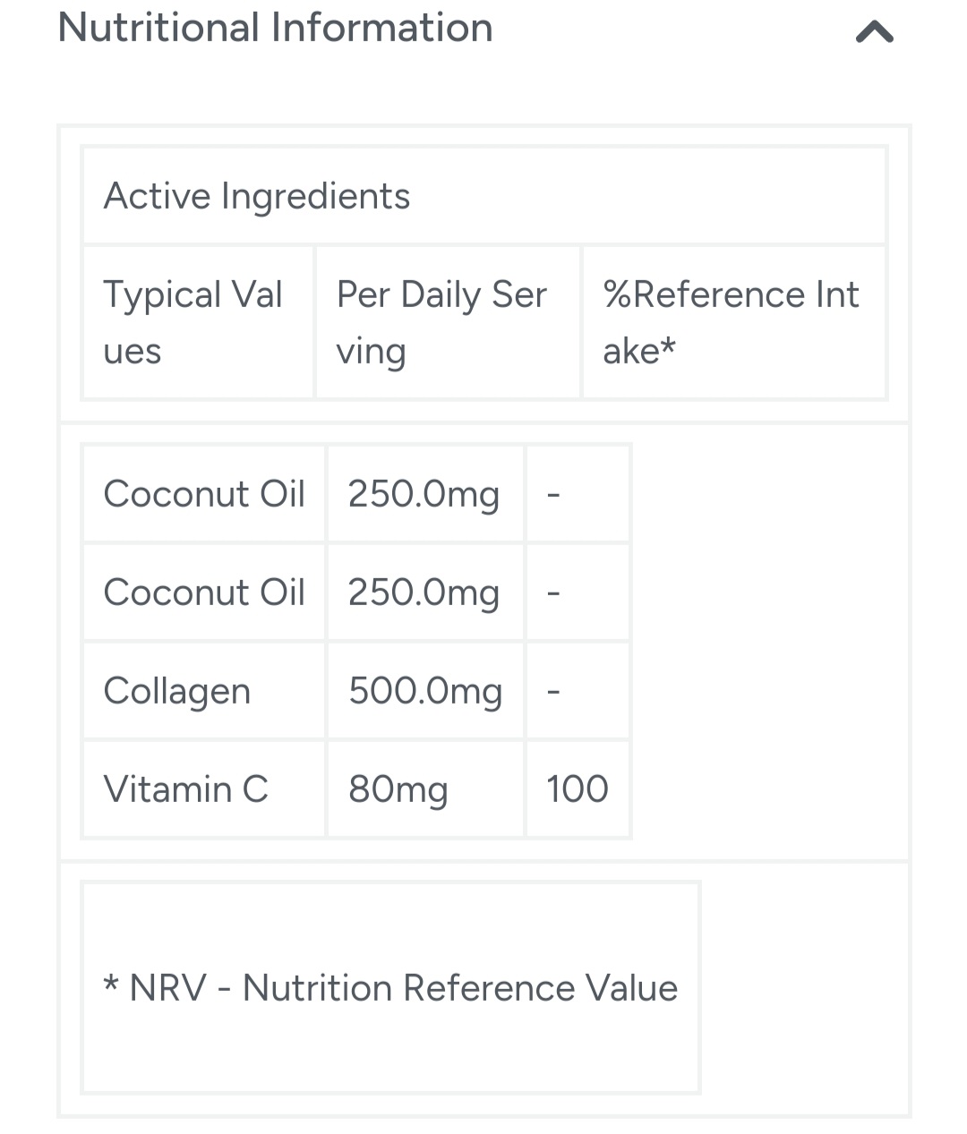 این محصول حاوی کلاژن دریایی - هیدرولیز شده برای بهبود فراهمی زیستی آن - و روغن نارگیل به عنوان منبع طبیعی تری گلیسیریدهای زنجیره متوسط است. ویتامین C اضافه شده به آن به تشکیل کلاژن در بدن و حفظ وضعیت پوست ما کمک میکند.